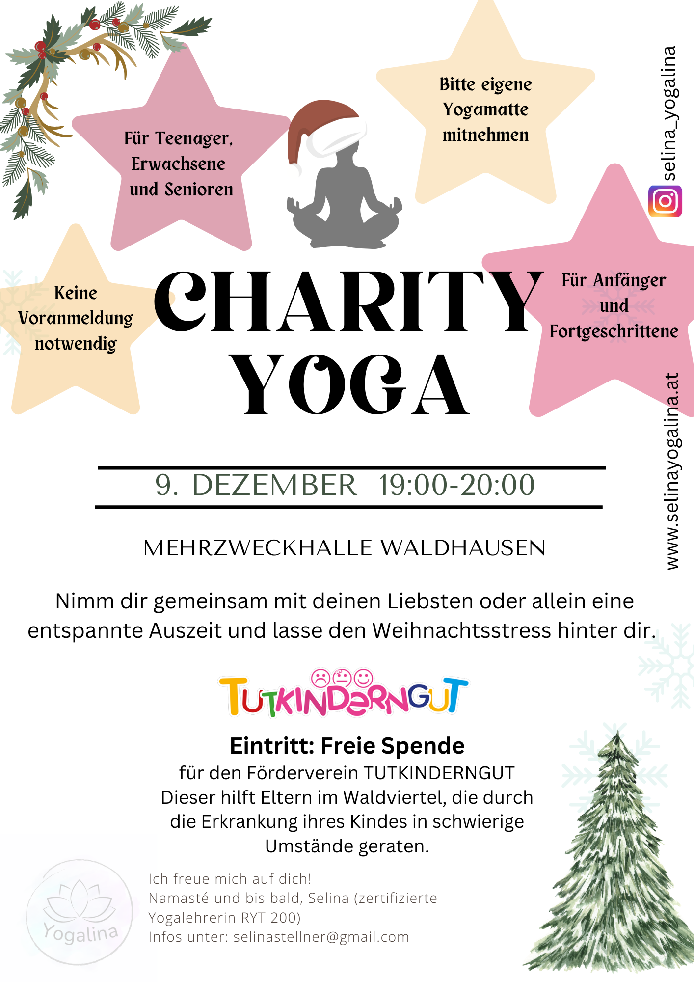 Was erwartet mich? Du darfst dich auf eine sanfte, weihnachtlich angehauchte Yogaeinheit freuen, die auch für Anfänger geeignet ist. Nimm gerne deine Familie und Freunde mit, die gesamten Einnahmen des Abends kommen dem Förderverein Tutkinderngut Zwettl zugute. Ich freue mich sehr auf einen gemütlichen gemeinsamen Abend.