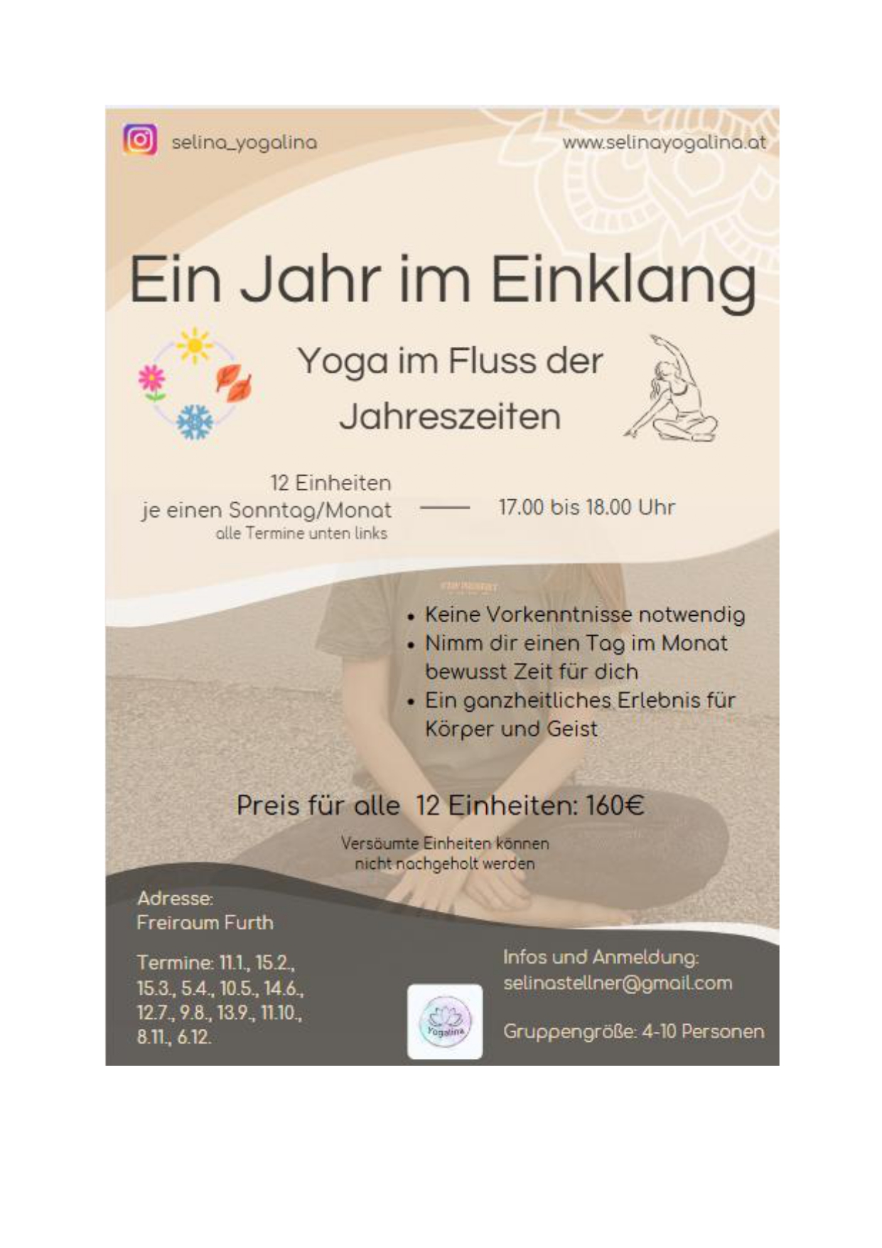Unter dem Motto „Ein Jahr im Einklang, Yoga im Fluss der Jahreszeiten“ lernst du in 12 achtsamen Yogastunden Interessantes über den Einfluss von den Jahreszeiten auf deinen Körper. Jedes Monat verbringst du somit zumindest diese eine Stunde auf der Yogamatte. Eine Stunde, die du hoffentlich gut in deinen Zeitplan einbauen kannst, wo du bewusst entschleunigst und in dich hinein spürst.